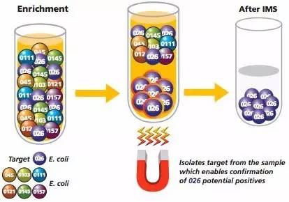 利用人工合成的內(nèi)含鐵成分,可被磁鐵磁力所吸引,外有功能基團,可結(jié)合活性蛋白質(zhì)(抗體)的磁珠,作為抗體的載體。當吸附在磁珠上的抗體與相應(yīng)的微生物或特異性抗原物質(zhì)結(jié)合后,則形成“抗原-抗體-磁珠免疫復(fù)合物”,這種復(fù)合物具有較高的磁響應(yīng)性,在磁鐵磁力的作用下定向移動,使復(fù)合物與其他物質(zhì)分離,而達到分離、濃縮、純化微生物或特異性抗原物質(zhì)的目的。