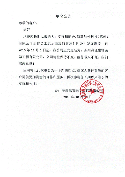公司發(fā)展需要,自2016年11月1日起,我司正式更名為蘇州海貍生物醫(yī)學(xué)工程有限公司,公司地址保持不變。.